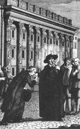 Anche quando andava a passeggio per Roma ne combinava di tutti i colori. Una volta si fece tagliare la barba a metà e così conciato camminava serio e a testa alta. Altre volte portava al guinzaglio strani animali o fra le braccia mazzi di fiori vistosi e al collo una pelliccia di martora che gli avevano regalato per riscaldarsi. Al passo vanitoso alternava il passo di danza e il balletto. I discepoli, che dovevano accompagnarlo in questi cortei carnevaleschi imparavano dal maestro l’arte di schernirsi. Quando uno di essi gli suggerì di non comportarsi in modo così disonorevole si beccò un grosso scappellotto.